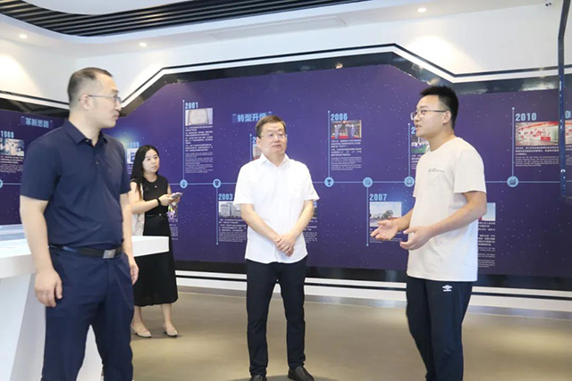 | 隨后,譚主席一行參觀了宏寶展廳,觀看了企業宣傳視頻,了解了宏寶集團的發展歷程,集團公司黨委書記丁亞龍匯報了集團近幾年的發展情況及勞模創新工作室取得的成績。 |